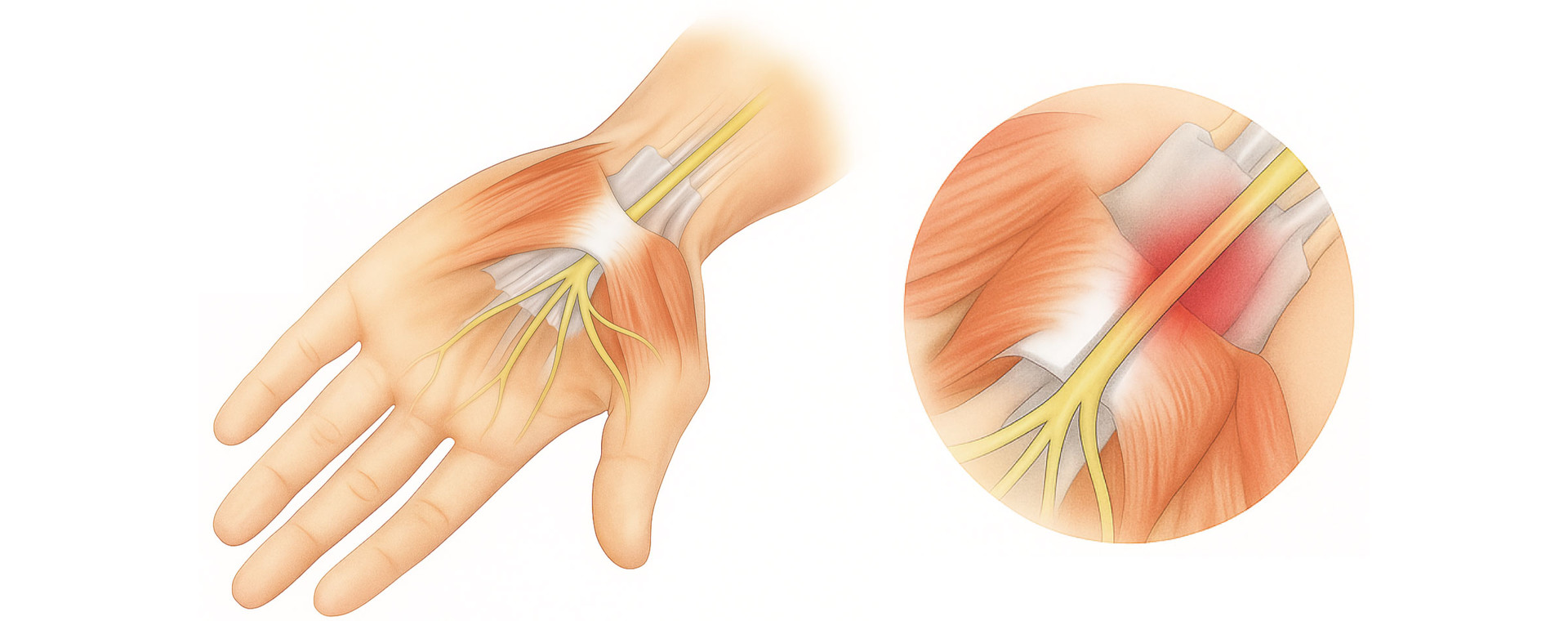 수근관은 뼈와 인대에 둘러싸여 공간이 매우 좁기 때문에, 작은 변화에도 신경이 쉽게 압박될 수 있습니다.