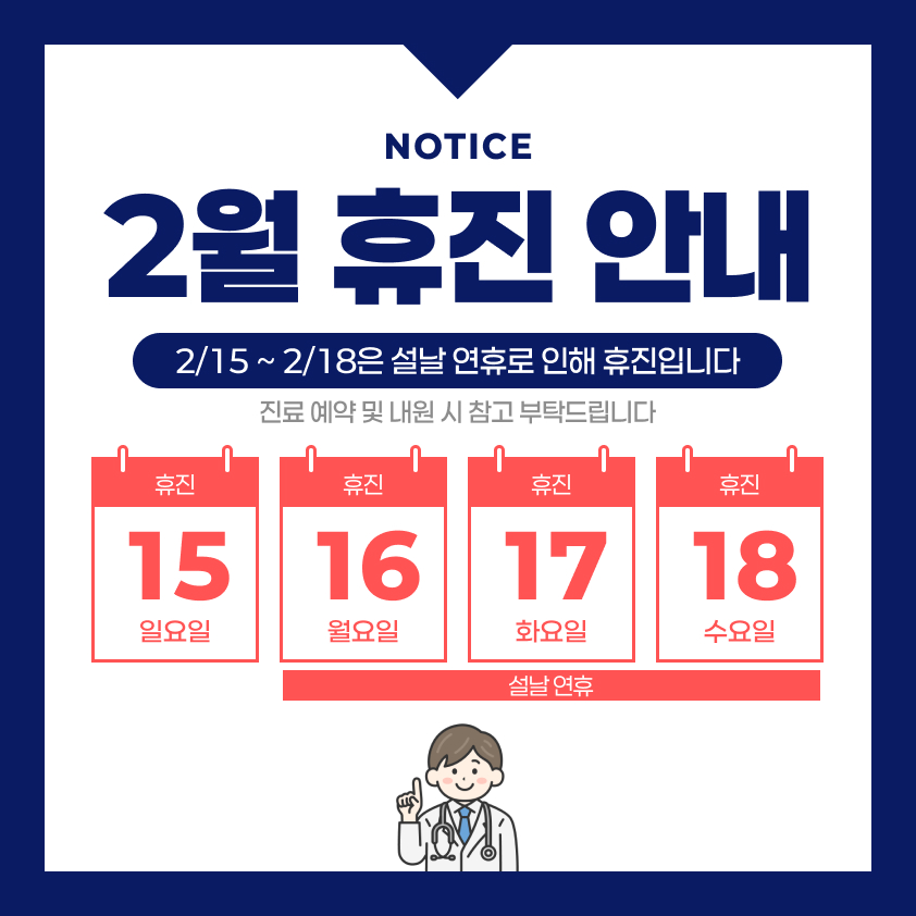 토 요 일 : 08:30 ~ 12:30 (처음 내원하시는 환자분은 12:00까지 접수)